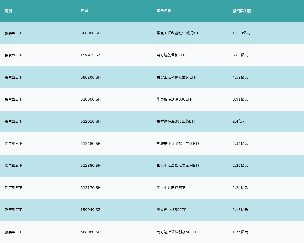 昨日股票型ETF融资买入额最高的3支ETF及其买入金额分别为:华夏上证科创板50成份ETF(12.39亿元)、易方达创业板ETF(6.63亿元)、嘉实上证科创板芯片ETF(4.59亿元)。融资买入额前10详情见下表: