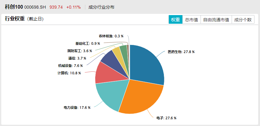 科创100ETF(588190)紧密跟踪科创100指数,该指数是从上海证券交易所科创板中选取市值中等且流动性较好的100只证券作为样本。目前来看,医药生物、电子、新能源及计算机是该指数的主要权重行业。