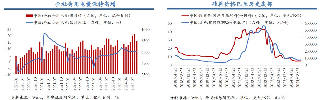 - 电新方面,三季报业绩超预期,且明年业绩预期有修复空间。全社会用电量持续保持高增速将对电力需求端形成持续实质性的支撑。海外方面,若美国大选将在一定程度上影响电新设备等基建材料、设备的出口需求。供给端,自律协定推动筑底预期及原材料价格进一步压缩,行业出清迎来加速。业绩改善确定性高的板块有望出现估值切换。
