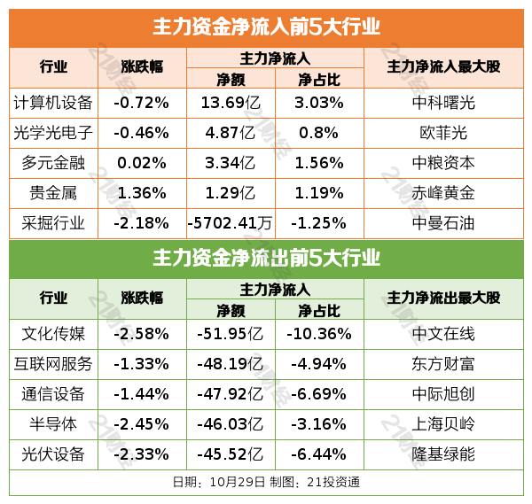 10月29日,市场全天震荡走低,创业板指领跌。截至收盘,沪指跌1.08%,深成指跌1.33%,创业板指跌2.32%。板块方面,智谱AI、脑机接口、AI手机、量子科技等板块涨幅居前,影视、煤炭、钢铁、CRO等板块跌幅居前。沪深两市全天成交额2.06万亿元,较上个交易日放量1992亿元。