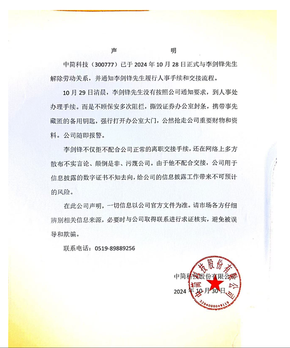 近日,市场流传出一份中简科技(300777.SZ)解聘董秘李剑锋的声明,落款日期为10月30日。
