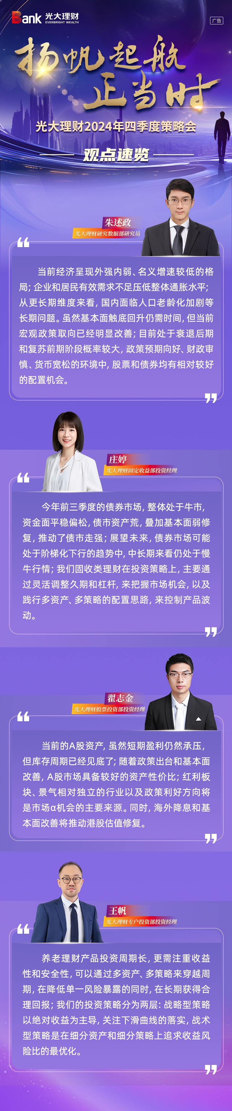 10月29日,光大理财成功举办“2024年四季度策略会——扬帆起航正当时”,公司研究数据部、固定收益部、股票投资部以及专户投资部的四位投研专家齐聚一堂,为您解析宏观政策、市场动态、投资策略。