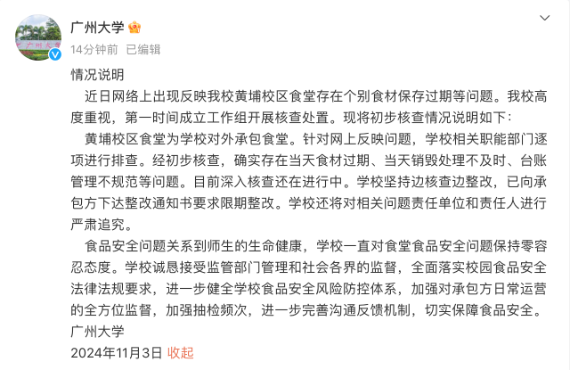 11月3日,广州大学官方微博发文回应食堂疑售过期食品。全文如下: