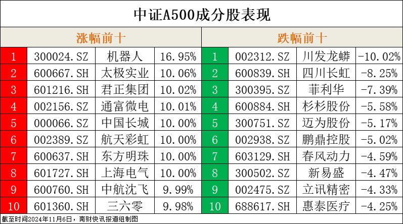 中证A500指数成分股涨幅前十、跌幅前十