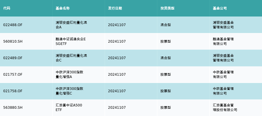 11月7日有6只新基金发行,分别为:浦银安盛红利量化混合A、融通中证诚通央企ESGETF、浦银安盛红利量化混合C、中欧沪深300指数量化增强A、中欧沪深300指数量化增强C、汇添富中证A500ETF,详情见下表: