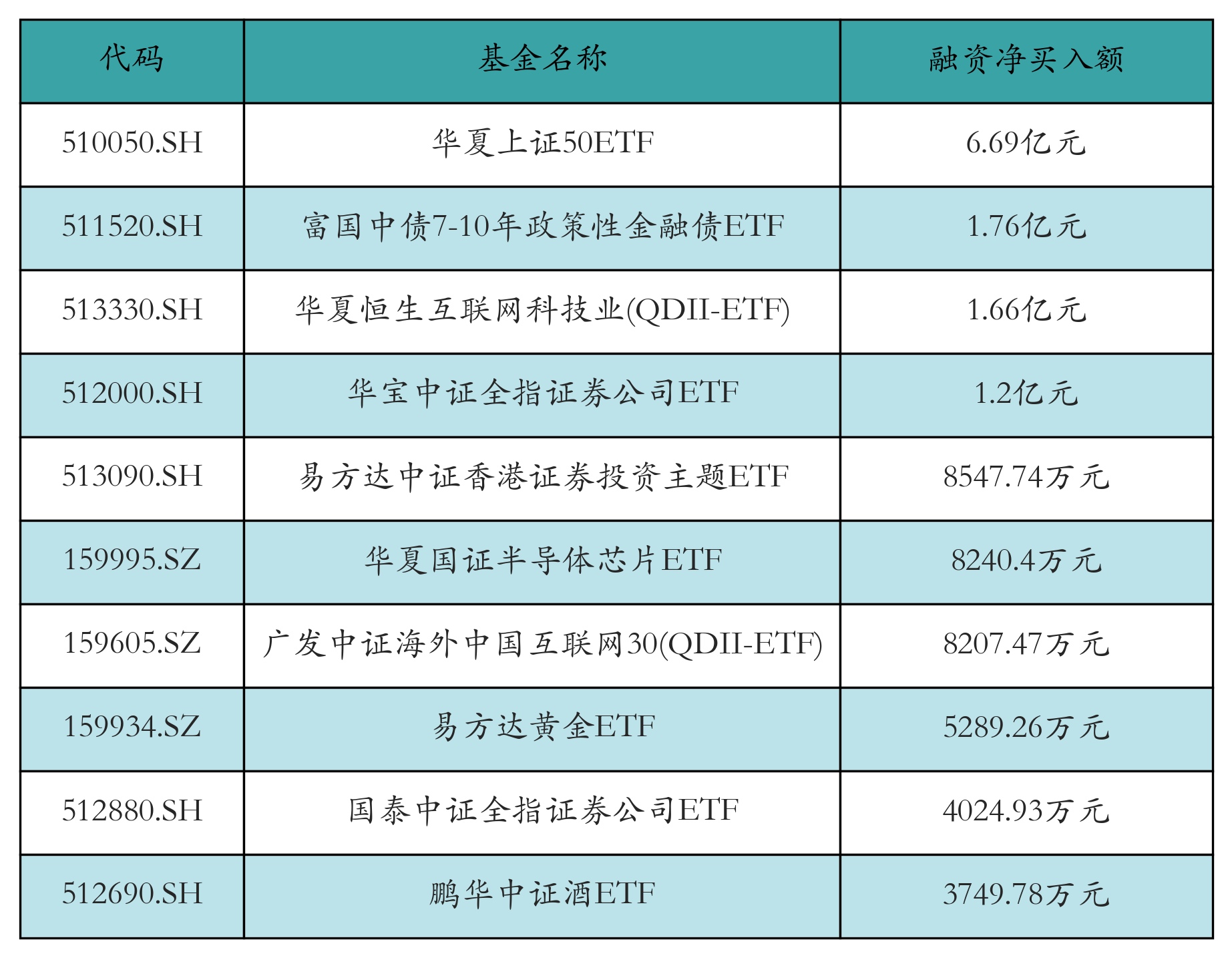 11月8日ETF融资净买入额前三位分别为:华夏上证50ETF(6.69亿元)、富国中债7-10年政策性金融债ETF(1.76亿元)和华夏恒生互联网科技业(QDII-ETF)(1.66亿元),前10具体见下表: