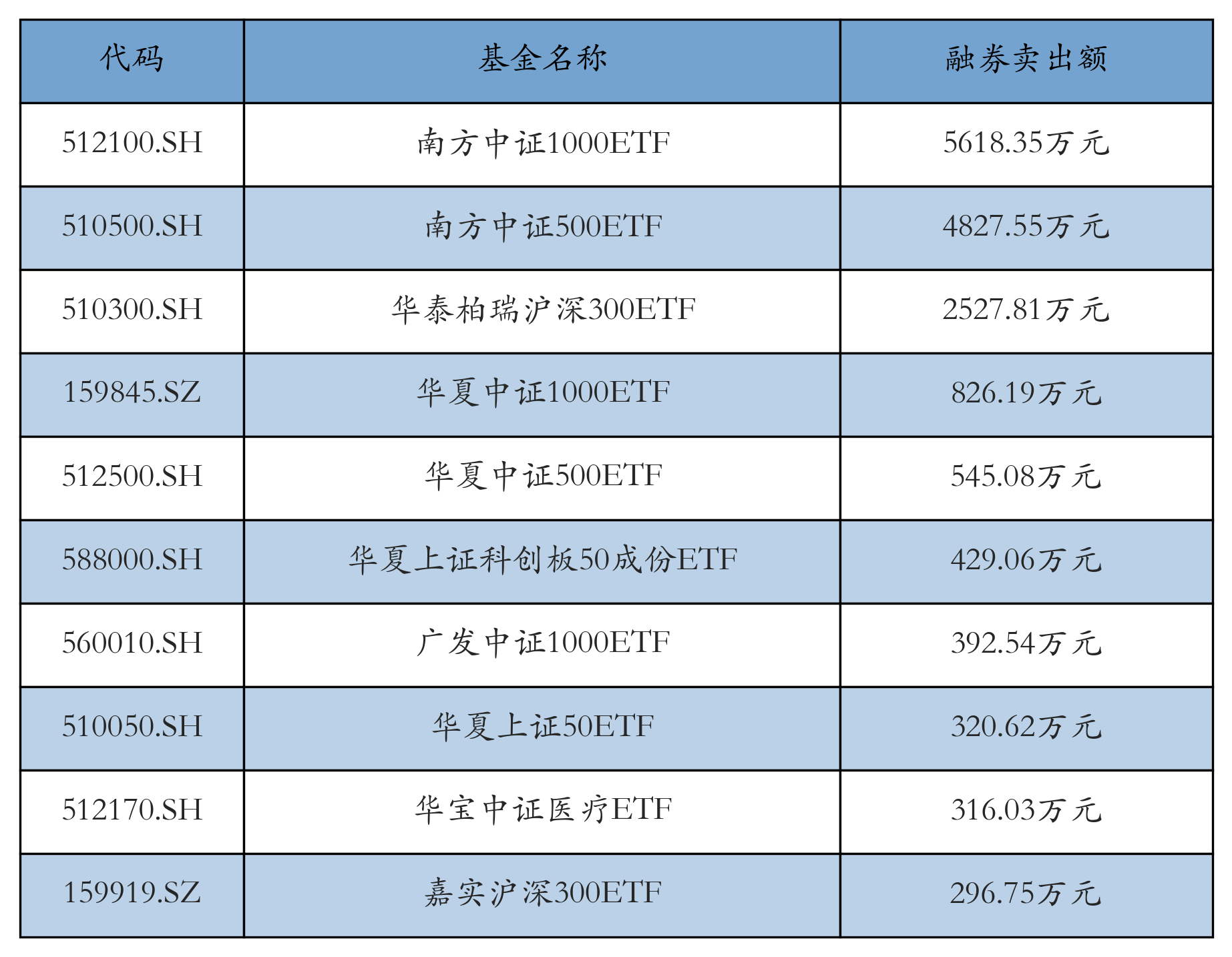 11月8日ETF融券卖出额前三位分别为:南方中证1000ETF(5618.35万元)、南方中证500ETF(4827.55万元)和华泰柏瑞沪深300ETF(2527.81万元),前10具体见下表:
