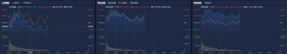 11月12日,市场早盘走势分化,三大指数涨跌不一。南财金融终端显示,截至午间收盘,沪指跌0.06%,深成指涨1.02%,创业板指涨1.78%。总体上个股涨多跌少,全市场超3000只个股上涨。
