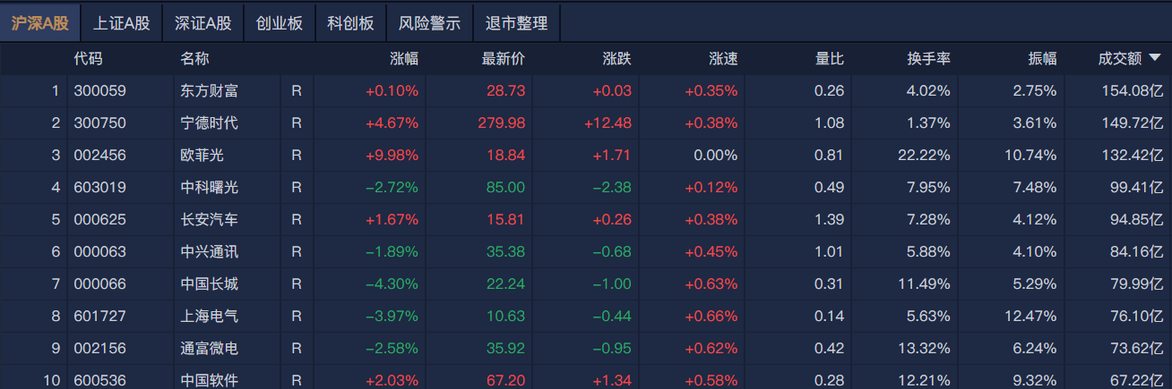 沪深两市半日成交额1.59万亿元,较上个交易日同期放量154亿元。个股方面,南财金融终端显示,东方财富半日成交额154.08亿元居首,宁德时代、欧菲光、中科曙光成交额靠前。