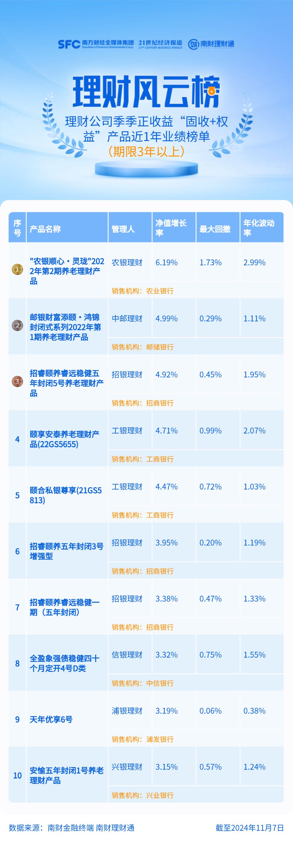 值得关注的是,本期长期限“固收+权益”产品榜单有多只养老理财产品的身影。农银理财“‘农银顺心·灵珑’2022年第2期养老理财产品”、中邮理财“邮银财富添颐·鸿锦封闭式系列2022年第1期养老理财产品”、招银理财“招睿颐养睿远稳健五年封闭5号养老理财产品”近1年净值增长率分别为6.19%、4.99%、4.92%,位列前三。