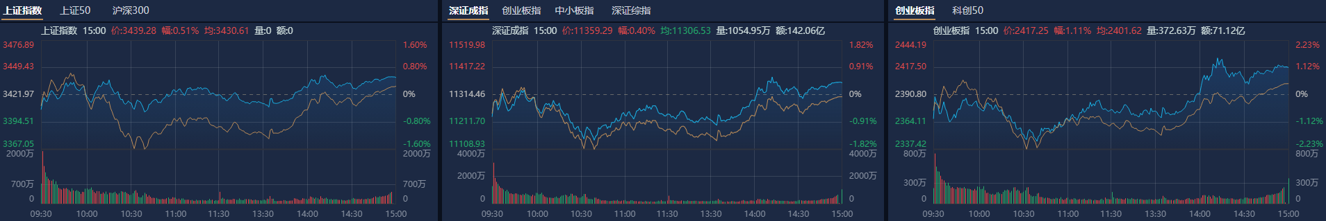 11月13日,市场全天探底回升,创业板指领涨。南财金融终端显示,截至收盘,沪指涨0.51%,深成指涨0.4%,创业板指涨1.11%。整体上个股上涨和下跌家数基本相当。