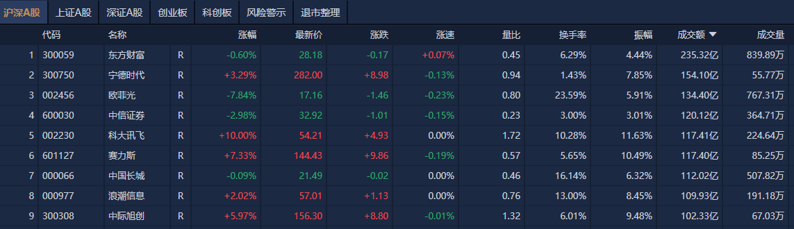 沪深两市全天成交额2.01万亿元,较上个交易日缩量5415亿元。个股方面,东方财富以超235亿元的成交额居首,宁德时代、欧菲光、中信证券、科大讯飞等多只个股成交额均在100亿元以上。