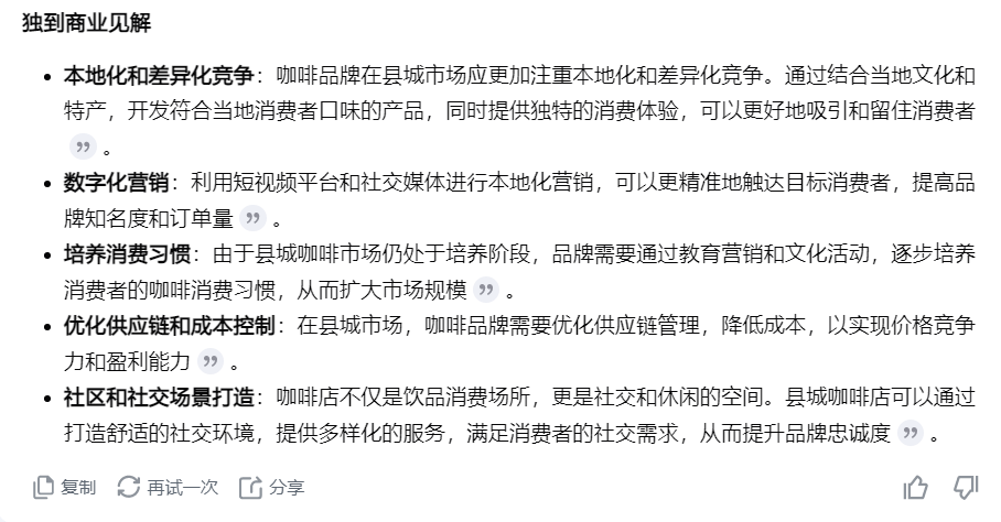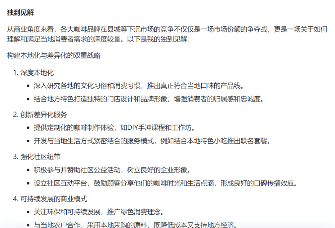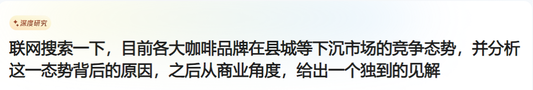 这回我们的要求是:“联网搜索一下,目前各大咖啡品牌在县城等下沉市场的竞争态势,并分析这一态势背后的原因,之后从商业角度,给出一个独到的见解。”