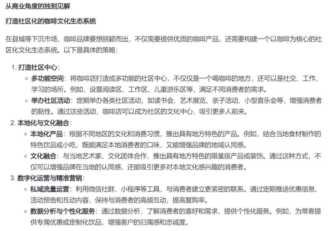 跟元宝对比,可以明显感受到回答的深度、质量上了一个台阶。例如“数字营销”“优化供应链”这些见地,不仅一针见血,而且针对性很强,显然是考虑到了县城客流量低,对价格竞争更敏感的特点。