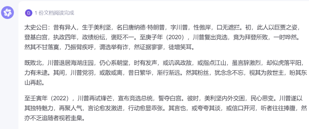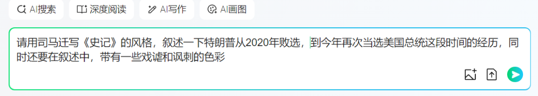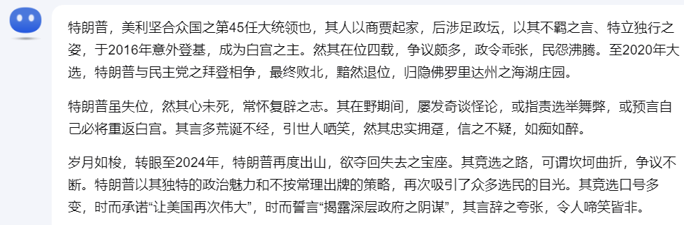 在这里,我们的要求是:“用司马迁写《史记》的风格,叙述一下特朗普从2020年败选,到今年再次当选美国总统这段时间的经历,同时还要在叙述中,带有一些戏谑和讽刺的色彩。”