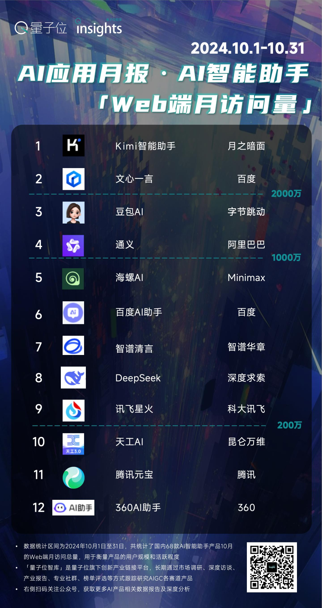 一个明显的表现是:在10月国内Web端AI助手的排行榜上,腾讯的AI产品元宝仅排在了第11位,月访问量不到200万,远不及百度的文心一言、与阿里的通义千问。