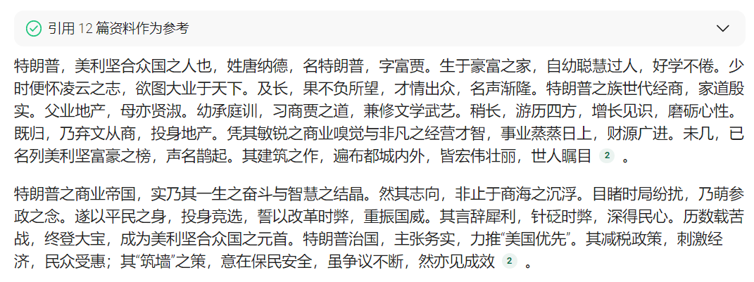 虽然在写作风格上,确实比较接近《史记》,但是元宝并没有按我们的要求,从特朗普2020年败选的经历开始叙述,而是从他幼年的经历开始讲起,并且也没看出戏谑和讽刺的色彩。