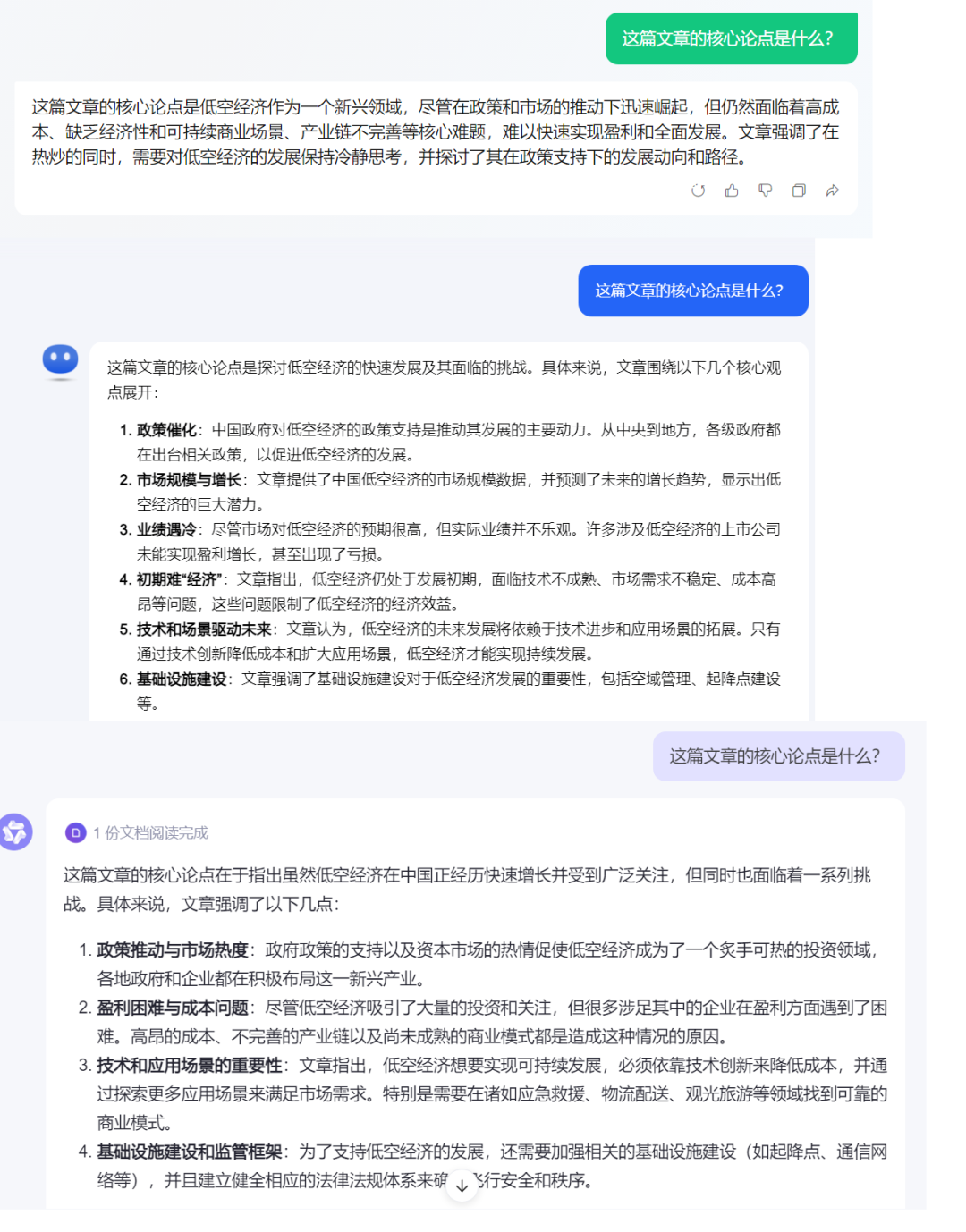 首先,我们试着让三个大模型,分别总结下,这篇文章的核心论点是什么。
