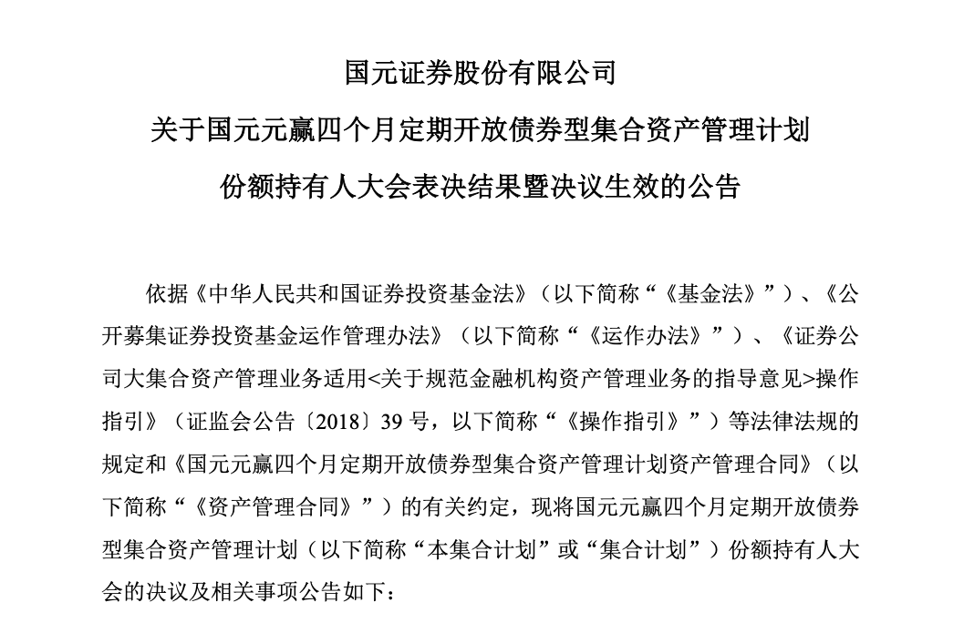 11月15日,国元证券发布《国元证券股份有限公司关于国元元赢四个月定期开放债券型集合资产管理计划份额持有人大会表决结果暨决议生效的公告》。会议表决通过国元元赢四个月定开债集合资管计划变更管理人为长盛基金的议案。