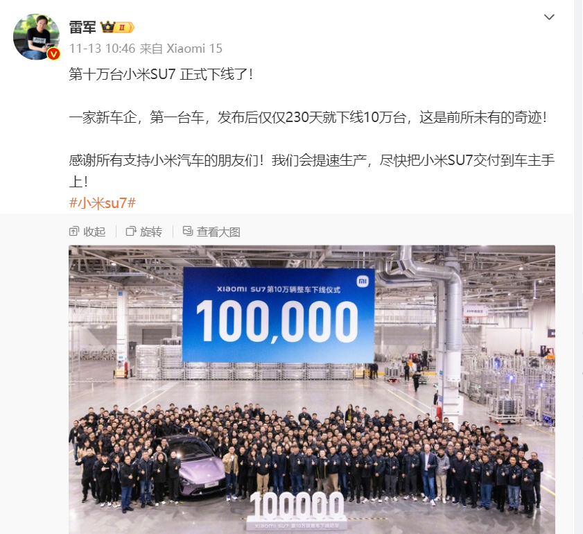 此外,11月13日,雷军发微博称,小米第10万辆SU7的下线仅用了230天。这一速度创造了新车企10万台最快下线的新纪录。