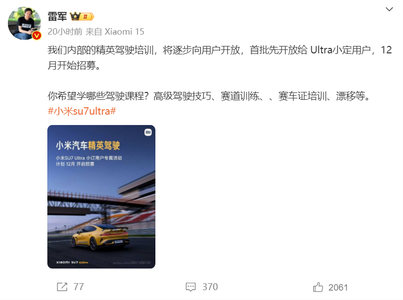 近日,雷军将推出小米驾校一事引起网友热议。11月16日上午,小米集团董事长兼CEO雷军在微博发文称,我们内部的精英驾驶培训,将逐步向用户开放,首批先开放给Ultra小定用户,12月开始招募。你希望学哪些驾驶课程?高级驾驶技巧、赛道训练、赛车证培训、漂移等。