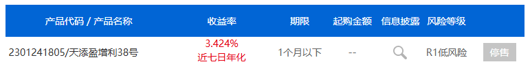 榜首浦银理财“天添盈增利38号”成立于2024年4月28日,业绩比较基准为7天通知存款利率,运作规模较小,三季度末产品总份额为326.49万元,近四成资金投向银行存款,其余资金投向单一信托计划,浦发银行官网显示该产品处于停售状态。