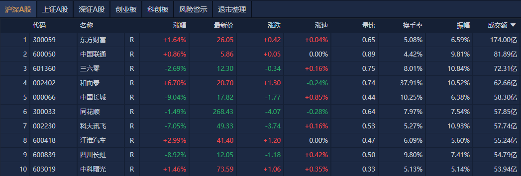 沪深两市半日成交额1.15万亿元,较上个交易日同期放量550亿元。个股方面,南财金融终端显示,东方财富成交额174.00亿元居首,中国联通、三六零、和而泰成交额靠前。