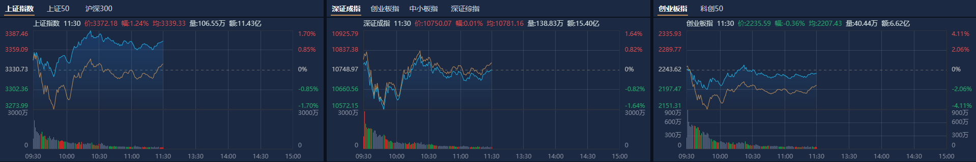 11月18日,市场早盘震荡分化,沪指震荡反弹,创业板指小幅调整。南财金融终端显示,截至午间收盘,沪指涨1.24%,深成指涨0.01%,创业板指跌0.36%。总体上个股上涨和下跌家数相差不大。