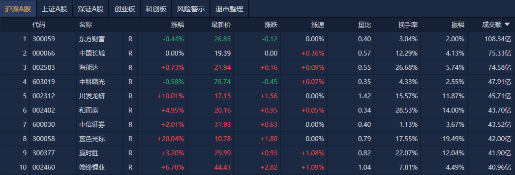 沪深两市半日成交额9551亿元,较上个交易日同期放量866亿元。个股方面,南财金融终端显示,东方财富成交额108.34亿元居首,中国长城、海能达、中科曙光成交额靠前。