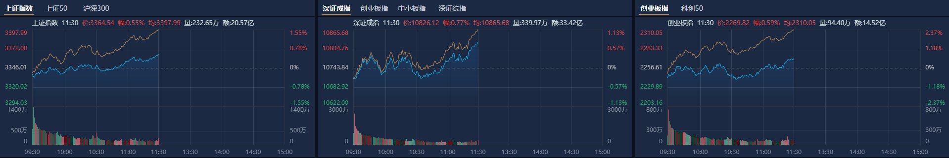 11月20日,市场早盘延续反弹,三大指数小幅上涨。南财金融终端显示,截至午间收盘,沪指涨0.55%,深成指涨0.77%,创业板指涨0.59%。总体上个股涨多跌少,全市场超4300只个股上涨,近180股涨超9%。
