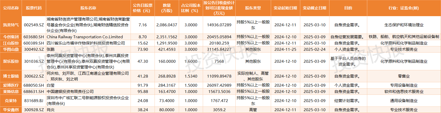 11月20日,据《投资快报》统计,昨日共有10家公司发布计划减持公告,涉及的公司包括双乐股份(301036.SZ)、莱斯信息(688631.SH)、克莱特(831689.BJ)、凯美特气(002549.SZ)、今创集团(603680.SH)、江山股份(600389.SH)、华图山鼎(300492.SZ)、华安鑫创(300928.SZ)、博士眼镜(300622.SZ)和爱博医疗(688050.SH)在内的多家企业,均发布了减持公告。这些企业的减持主体包括实际控制人、持股5%以上的股东以及其他股东,减持的原因也各不相同,主要包括个人或企业资金需求等。