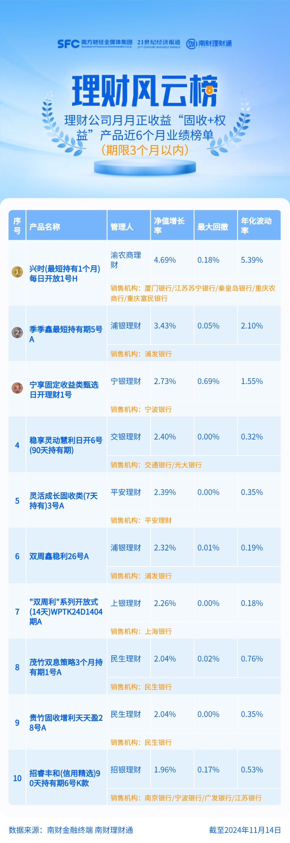 榜单前三名包括2只持有期产品和1只日开产品,渝农商理财“兴时(最短持有1个月)每日开放1号H”近6月净值增长率4.69%位列第一,浦银理财“季季鑫最短持有期5号A”和宁银理财“宁享固定收益类甄选日开理财1号”位列二三,近6月净值增长率分别为3.43%、2.73%。