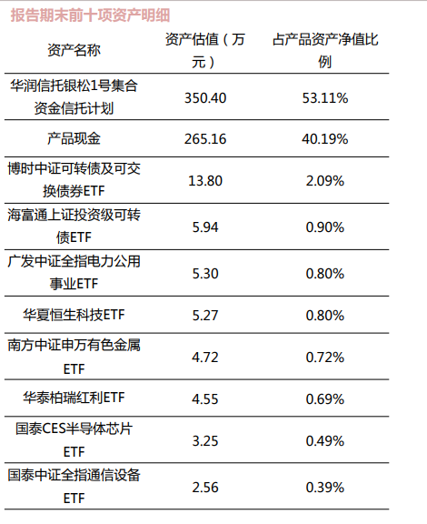 穿透后,该产品现金及银行存款、债券分别占比42.42%、33.4%,同业存单和公募基金占比均在10%左右,少量投资于拆放同业及债券买入返售、权益类投资。从前十大持仓来看,公募基金主要为短债基金和货币基金,投资风格比较稳健。
