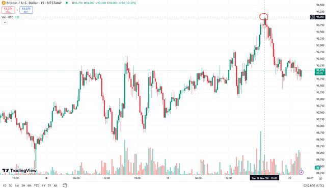 比特币作为世界上最大、也是最知名的加密货币,今年已经累计上涨了一倍多。截至发稿,报92,057美元,稍早时段曾触及94,057美元的纪录高位。