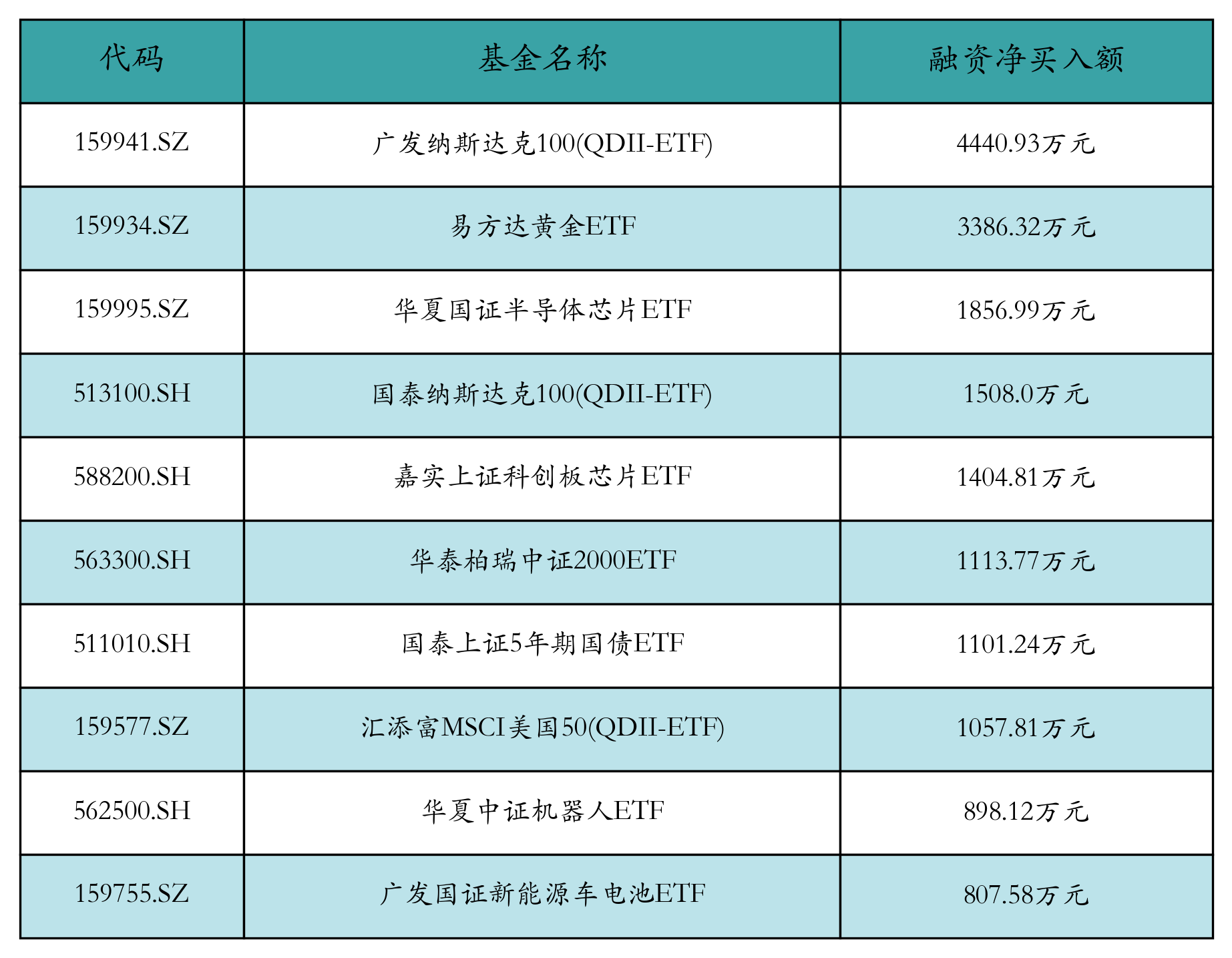 11月20日ETF融资净买入额前三位分别为:广发纳斯达克100(QDII-ETF)(4440.93万元)、易方达黄金ETF(3386.32万元)和华夏国证半导体芯片ETF(1856.99万元),前10具体见下表: