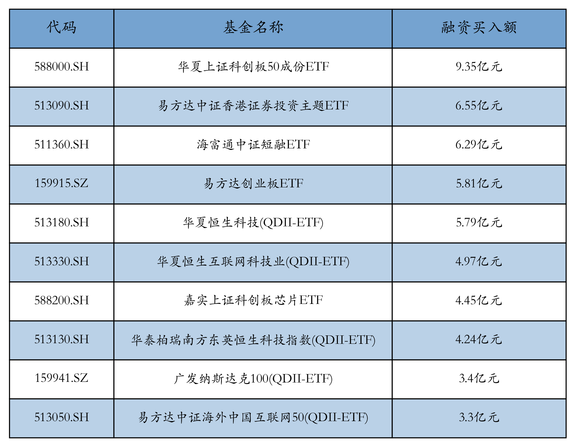 11月20日ETF融资买入额前三位分别为:华夏上证科创板50成份ETF(9.35亿元)、易方达中证香港证券投资主题ETF(6.55亿元)和海富通中证短融ETF(6.29亿元),前10具体见下表:
