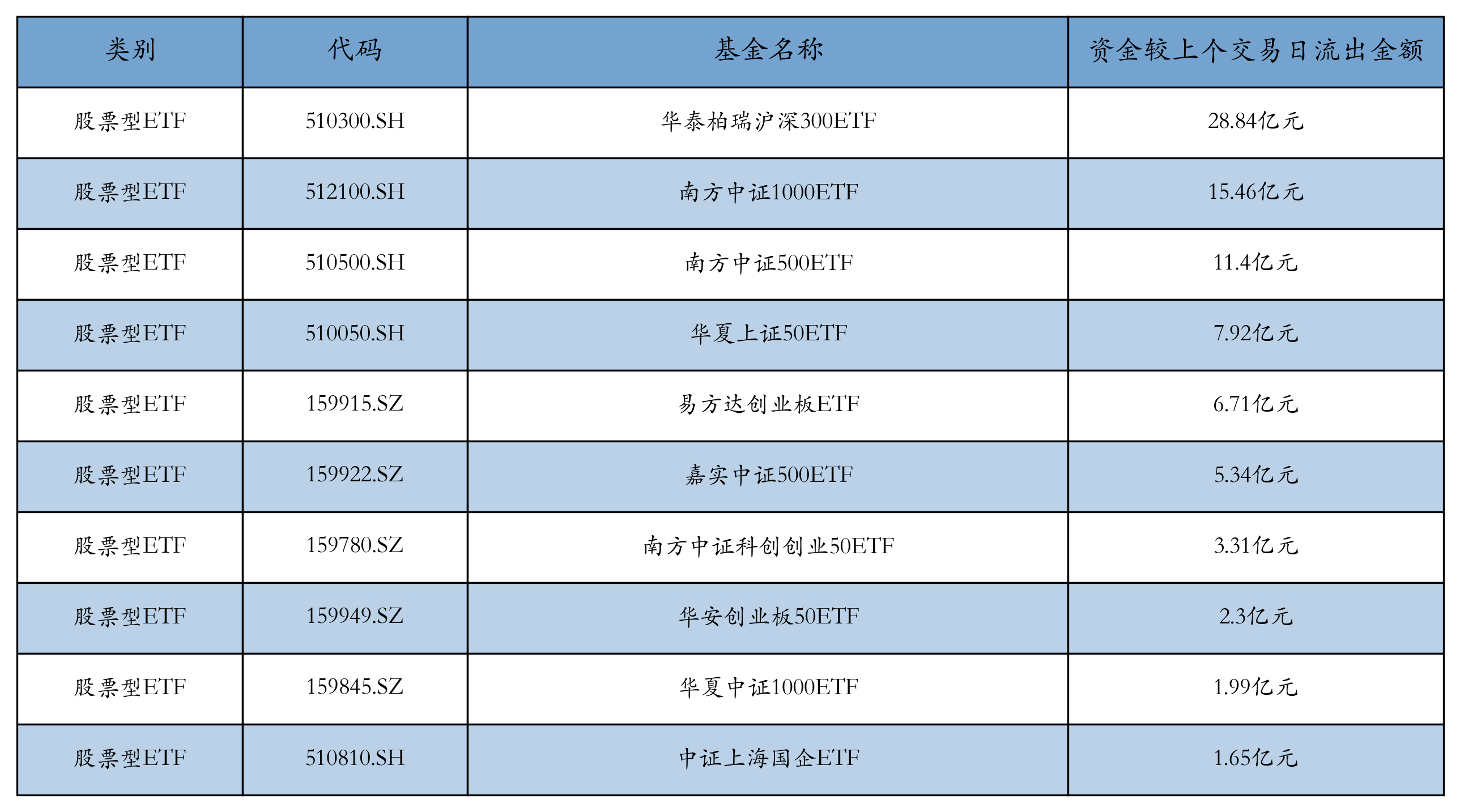 昨日股票型ETF资金流出最多的3支ETF及其流出金额分别为:华泰柏瑞沪深300ETF(流出28.84亿元)、南方中证1000ETF(流出15.46亿元)、南方中证500ETF(流出11.4亿元)。资金流出前10详情见下表: