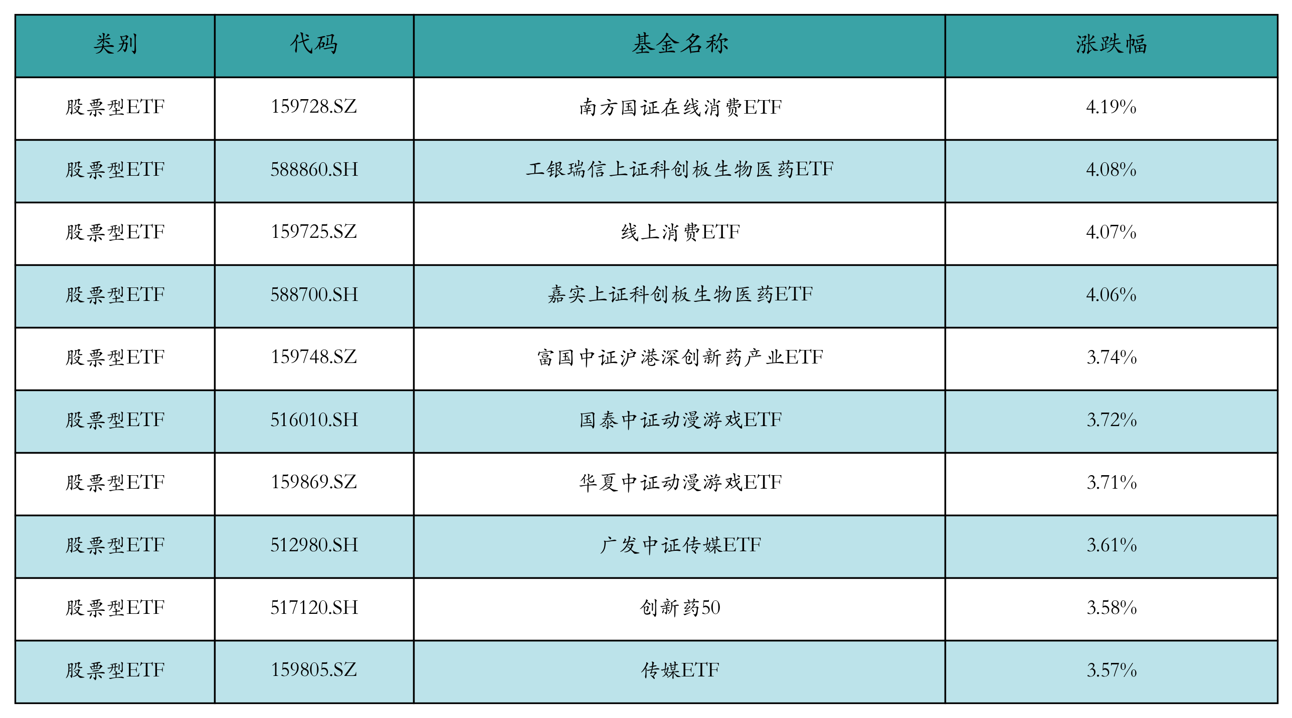 昨日股票型ETF涨幅最高的3支ETF及其收益率分别为:南方国证在线消费ETF(4.19%)、工银瑞信上证科创板生物医药ETF(4.08%)、线上消费ETF(4.07%)。涨幅前10详情见下表: