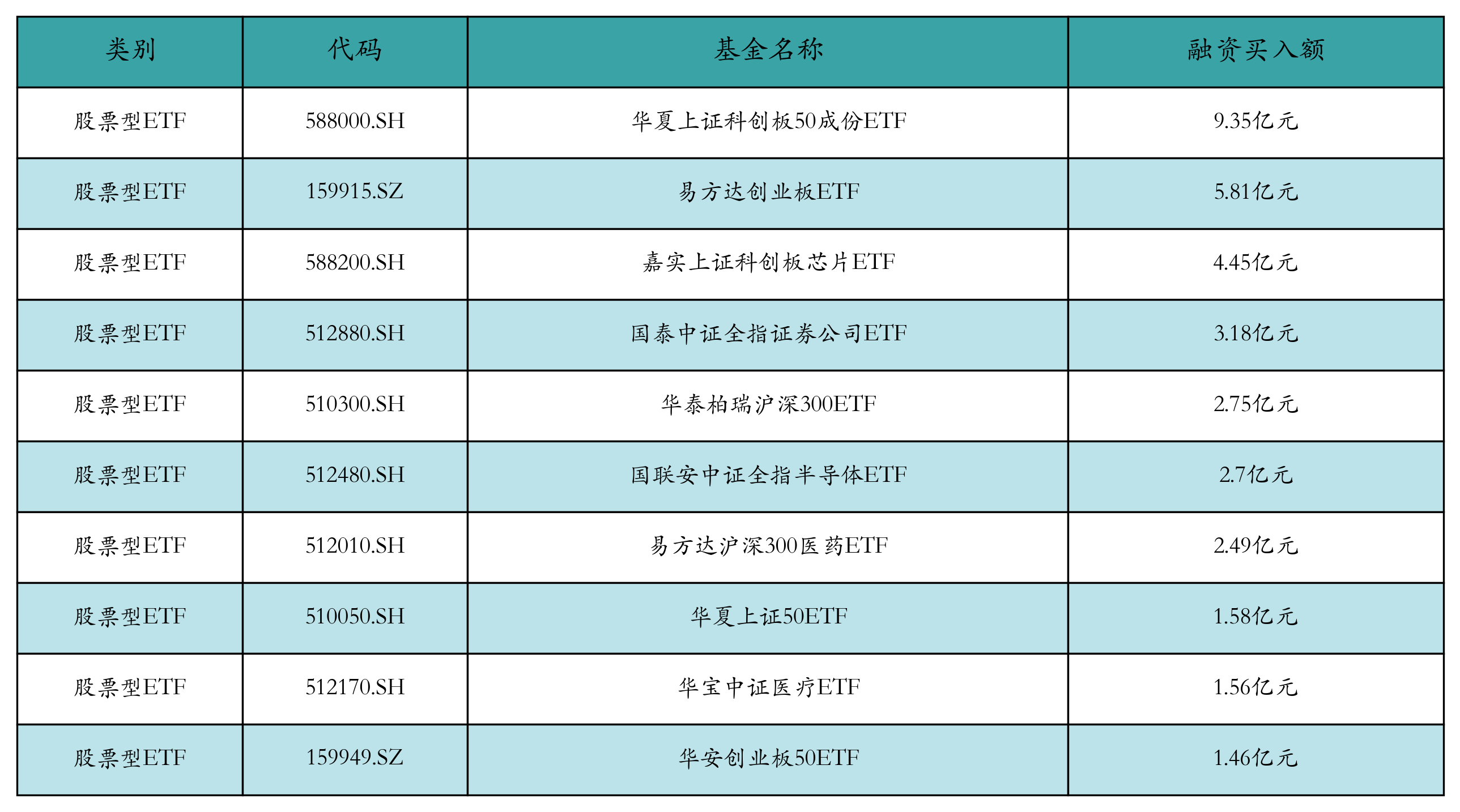 昨日股票型ETF融资买入额最高的3支ETF及其买入金额分别为:华夏上证科创板50成份ETF(9.35亿元)、易方达创业板ETF(5.81亿元)、嘉实上证科创板芯片ETF(4.45亿元)。融资买入额前10详情见下表: