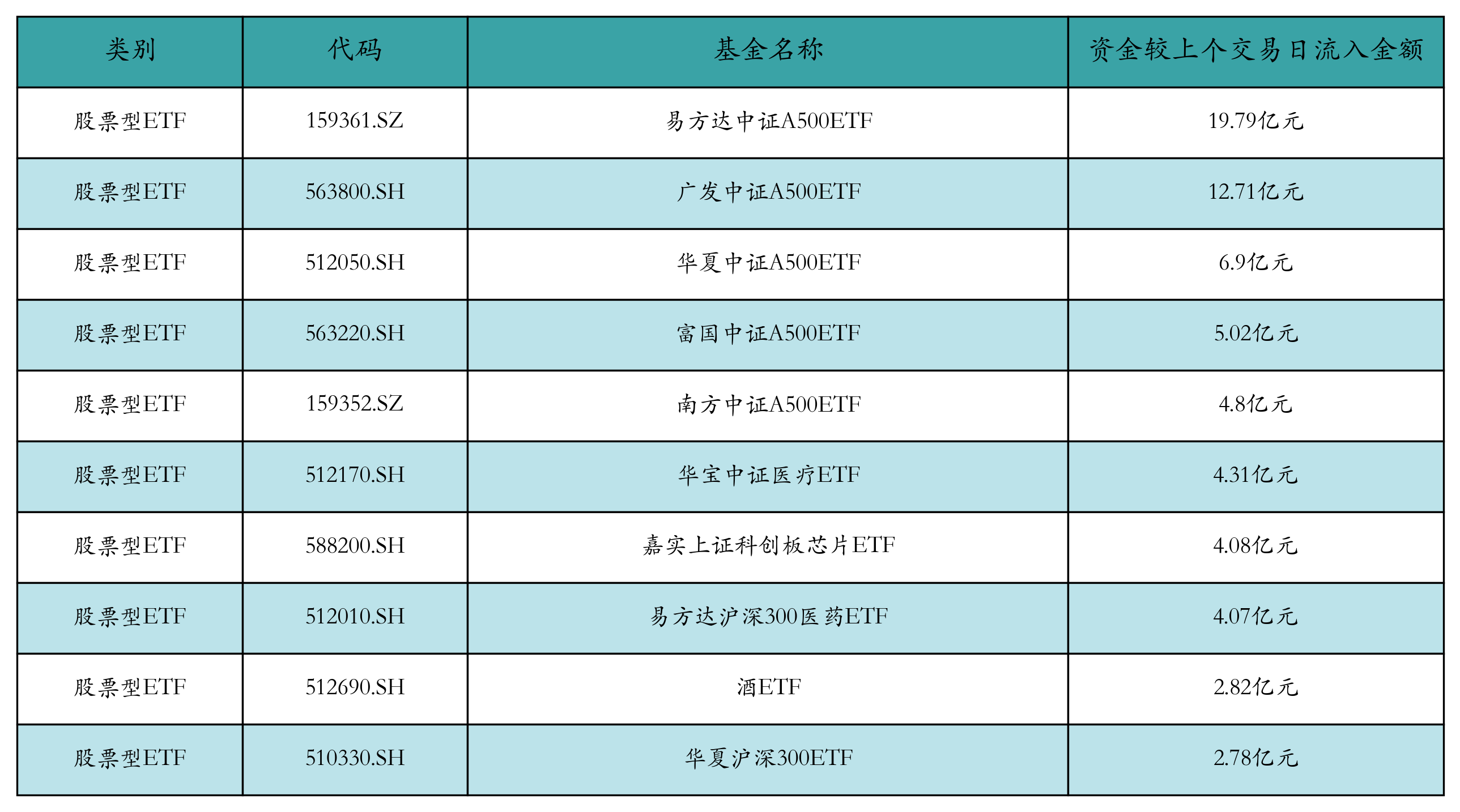 昨日股票型ETF资金流入最多的3支ETF及其流入金额分别为:易方达中证A500ETF(流入19.79亿元)、广发中证A500ETF(流入12.71亿元)、华夏中证A500ETF(流入6.9亿元)。资金流入前10详情见下表: