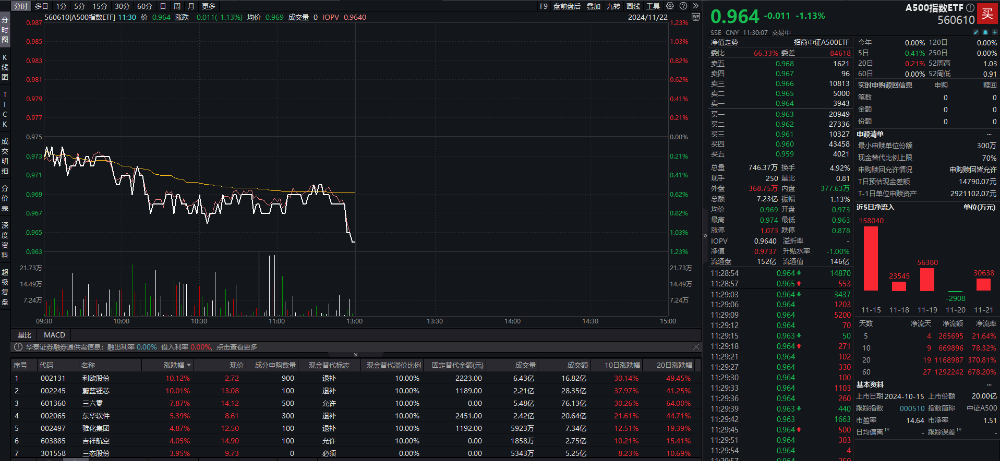 资金流向方面,wind数据显示,A500指数ETF(560610)自10月15日上市以来累计“吸金”超129亿元。截至11月21日,最新流通规模约147亿元,最新流通份额约151亿份。