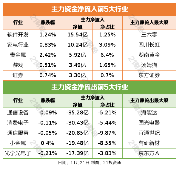 11月21日,市场全天窄幅震荡,三大指数涨跌不一,均录得3连阳。截至收盘,沪指涨0.07%,深成指跌0.07%,创业板指跌0.09%。沪深两市全天成交额1.61万亿元,较上个交易日缩量29.5亿元。总体上个股上涨和下跌家数相差不大。