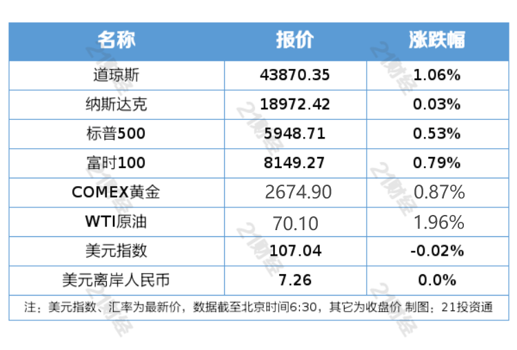 纽约股市三大股指21日上涨。截至当天收盘,道琼斯工业平均指数比前一交易日上涨461.88点,收于43870.35点,涨幅为1.06%;标准普尔500种股票指数上涨31.60点,收于5948.71点,涨幅为0.53%;纳斯达克综合指数上涨6.28点,收于18972.42点,涨幅为0.03%。
