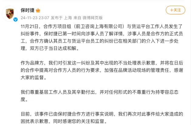 11月23日深夜,保时捷官方回应“合作方员工与货拉拉司机纠纷事件”,称合作方项目组(前卫咨询上海有限公司)与货运平台工作人员发生了纠纷事件,保时捷已第一时间向涉事人员了解详情,涉事人员是合作方的正式员工,合作方确认其员工与货运平台员工的纠纷已在相关部门的介入下进一步处理,双方已于当日达成和解。