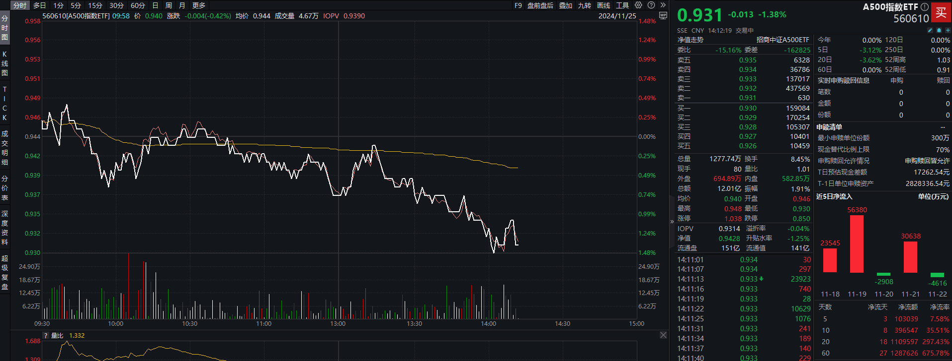 资金流向方面,wind数据显示,A500指数ETF(560610)自10月15日上市以来累计“吸金”近129亿元。截至11月22日,该ETF最新规模142.51亿元,最新流通份额151.16亿份。