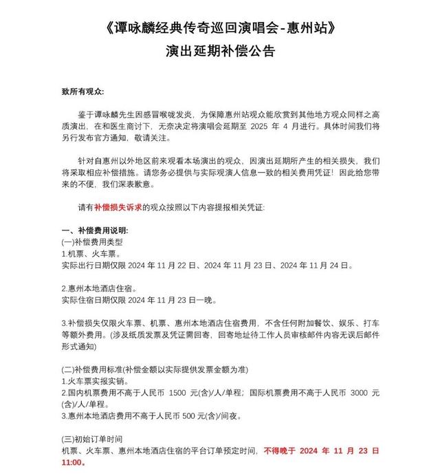 据了解,谭咏麟经典传奇巡回演唱会惠州站原定于11月23日19:30在惠州奥林匹克体育场举行。延期公告称,谭咏麟因感冒喉咙发炎,为保障惠州站观众能欣赏到其他地方观众同样之高质演出,在和医生商讨下,无奈决定今晚(11月23日)演唱会取消,并延期至2025年4月。