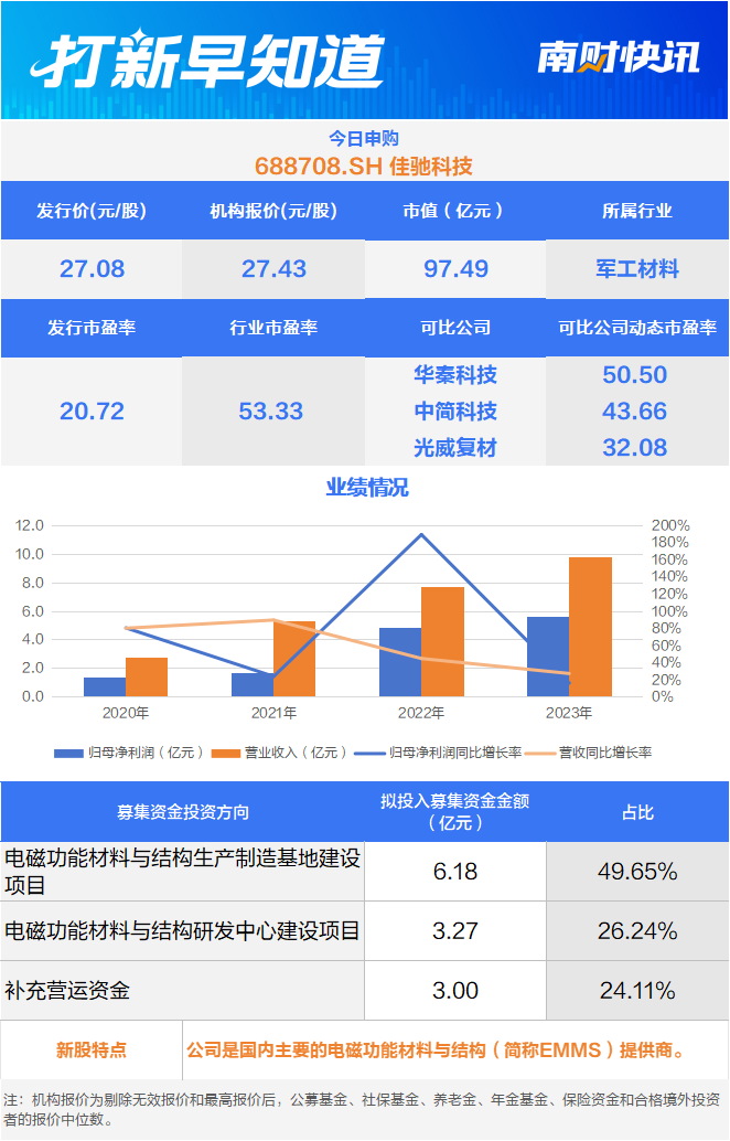 11月25日,可申购科创板上市的佳驰科技(688708.SH),该公司主营业务是EMMS产品的研发、生产和销售,曾突破EMMS产品的“薄型化”和“超宽带”等关键技术瓶颈。