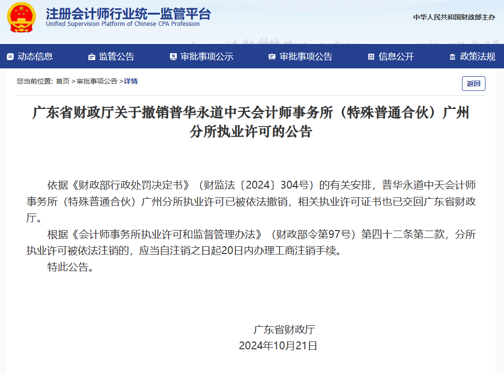 南财快讯记者注意到,注册会计师行业统一监管平台于10月披露了广东省财政厅关于撤销普华永道中天会计师事务所(特殊普通合伙)广州分所执业许可的公告。