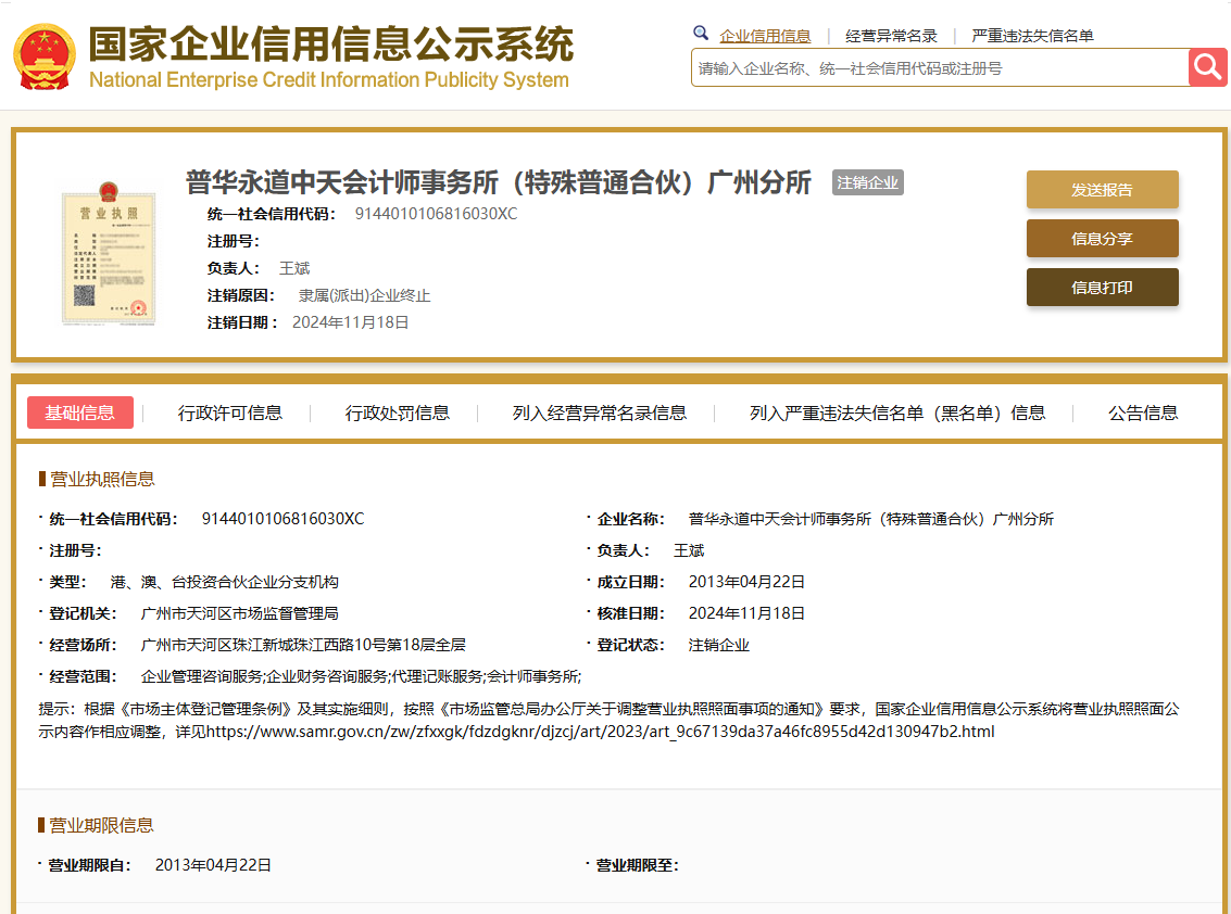 近日,普华永道中天会计师事务所(特殊普通合伙)广州分所经营状态变更为注销。国家企业信用信息公示系统显示,该分所的注销原因为“隶属(派出)企业终止”,注销日期为2024年11月18日。