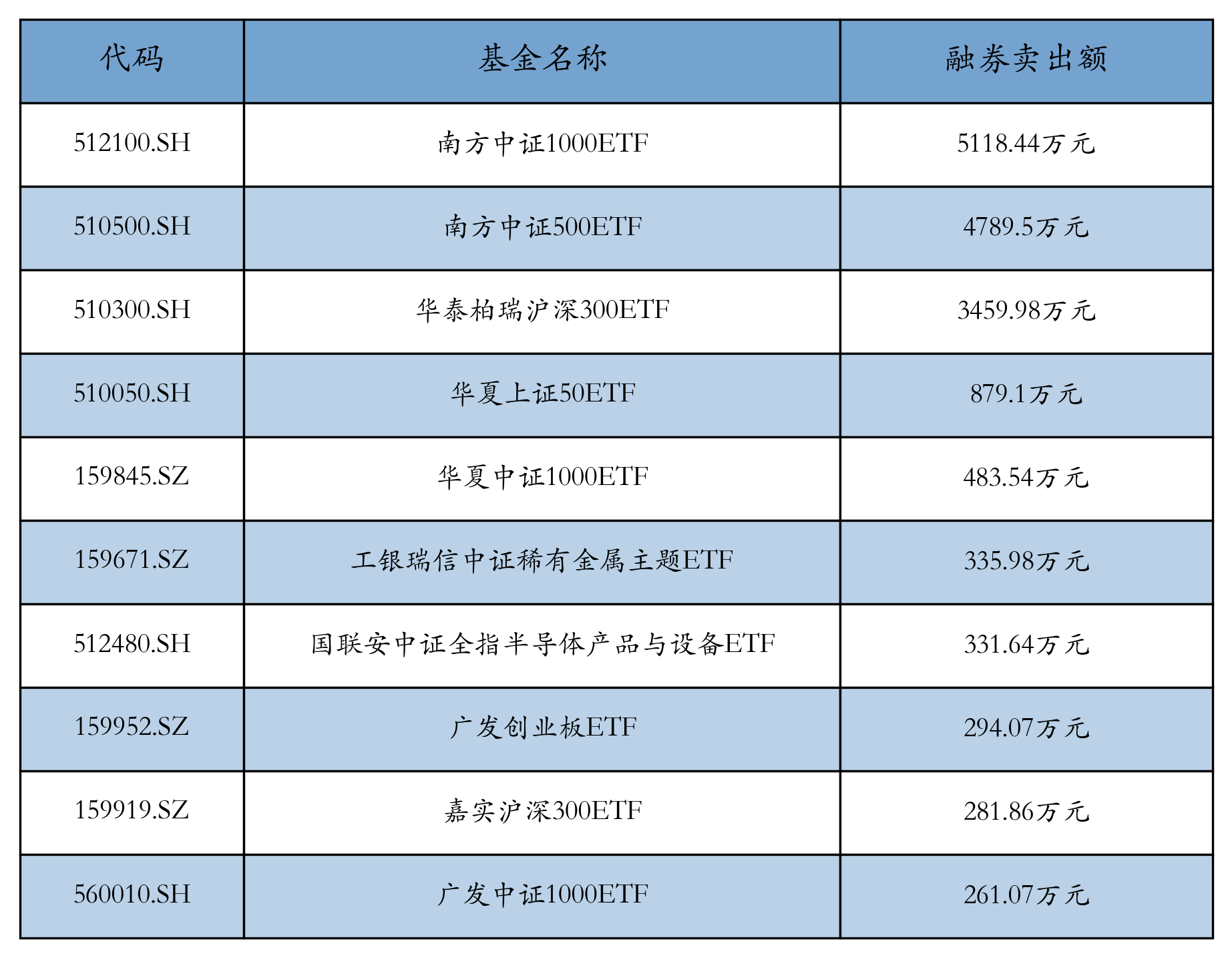 11月22日ETF融券卖出额前三位分别为:南方中证1000ETF(5118.44万元)、南方中证500ETF(4789.5万元)和华泰柏瑞沪深300ETF(3459.98万元),前10具体见下表: